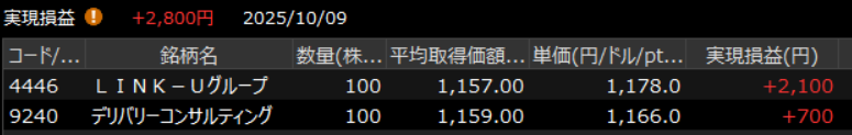 本日の収支 +2,800円 2勝0敗 100.00%
